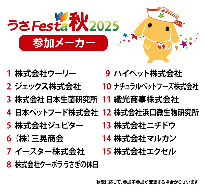 日本を代表するうさぎ用品、フードメーカーさんが一堂に会します。今回は、15社のメーカーが出展いたします。 ☆参加メーカーの詳細情報は下の画像をクリックしてご確認ください。