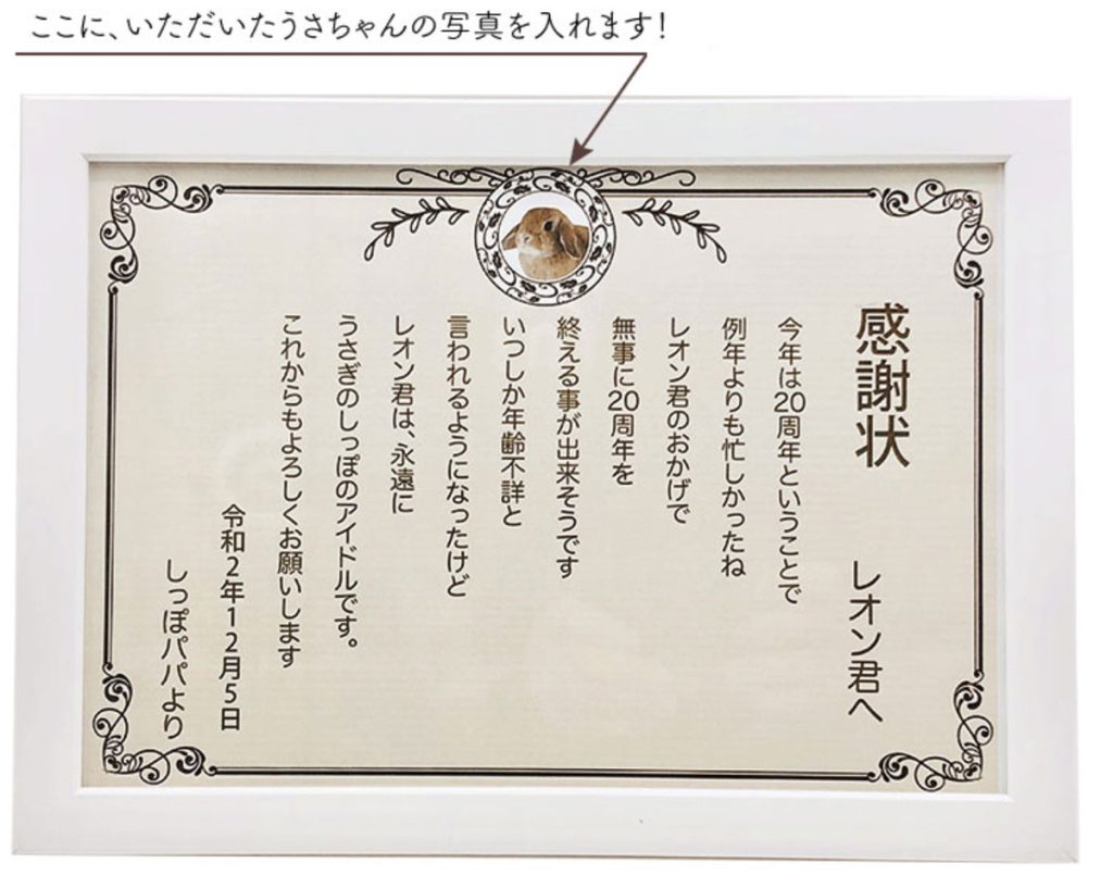 うさフェスタでの会場展示だけでなく、うさフェスタ終了後に、ご自宅へ「感謝状」をお届けしますので手元に残せます。