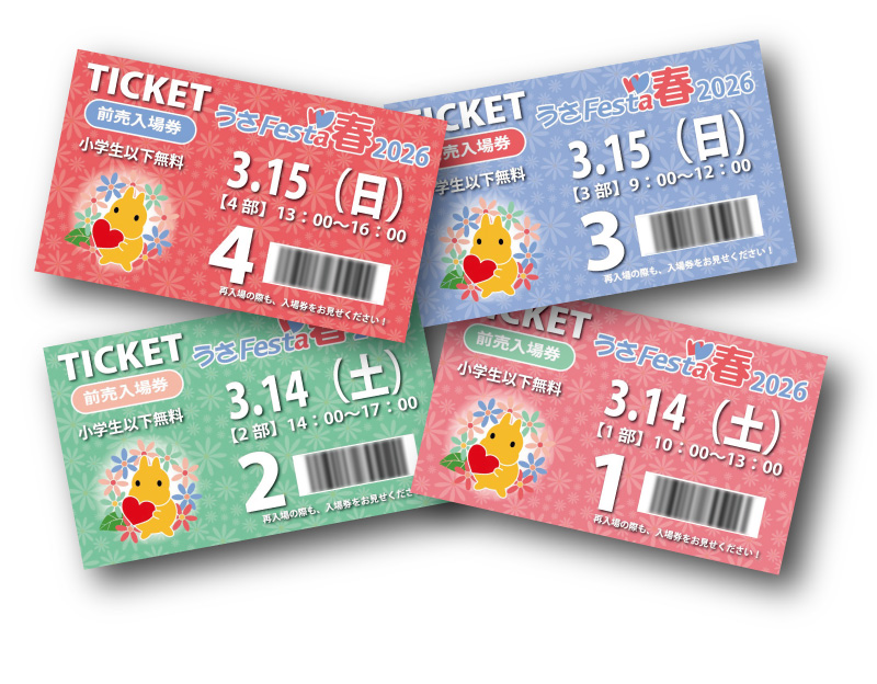 セブンイレブン、ファミリーマートで前売り入場券をご購入いただいた場合は、うさフェスタ当日に会場入り口にて、下記のようなビジュアルチケットに引き換えをいたします。