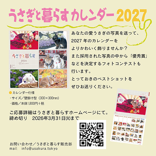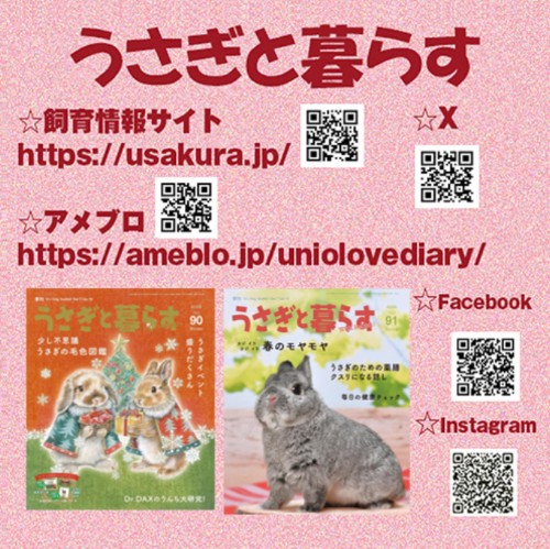 たくさんのうさぎを愛する方に出会えるのが「うさフェスタ」です。 この春は最新刊発売とほぼ一緒のタイミングとなり、ブースとして出展できるのを心待ちにしていました。 今回はブースで撮影をしたり、最新刊を披露したり、皆さまといろんなうさぎトークができるのを楽しみにしております。 うさぎと暮らすは2001年に創刊し、早いもので今春で25年目になります。 今の会社体制になって7年目になりました。 うさくらでないとできない企画を心掛け、うさぎを愛するみなさまと精進していきたいと思います。 変わらぬご愛顧のほど、よろしくお願いいたします!