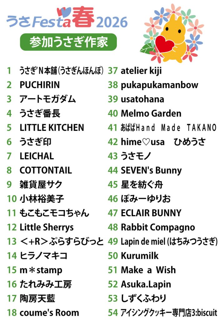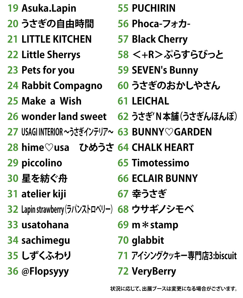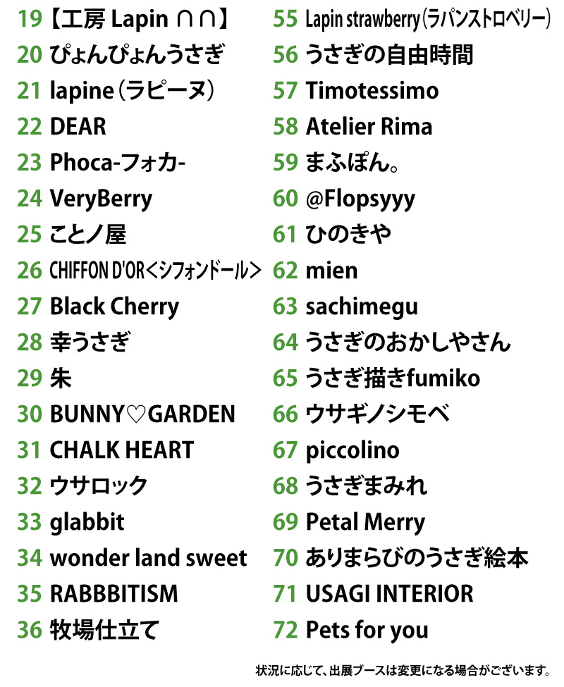 今回は、72組のうさぎ作家が出展します。 ☆参加うさぎ作家の詳細情報は下の画像をクリックしてご確認ください。