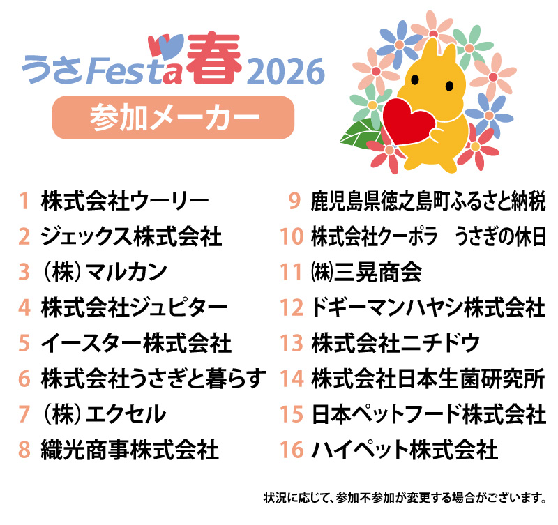 日本を代表するうさぎ用品、フードメーカーさんが一堂に会します。今回は、16社のメーカーが出展いたします。 ☆参加メーカーの詳細情報は下の画像をクリックしてご確認ください。